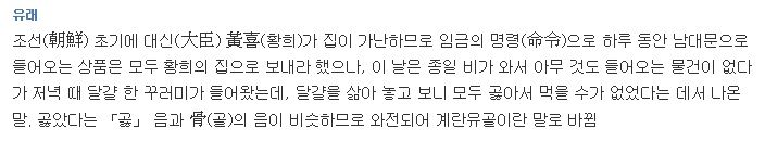鷄 : 닭 '계' 卵 : 알 '란' 有 : 있을 '유' 骨 : 뼈 골